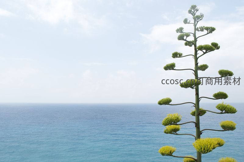 一株高耸的龙舌兰在蔚蓝大海和晴朗天空的背景下傲然绽放,其独特的形态与壮阔的海景构成一幅充满生命力的自然画卷。