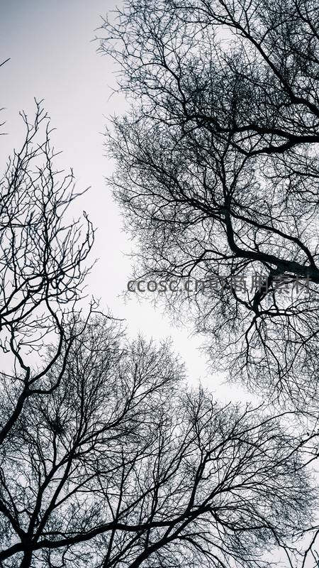 从低角度仰视拍摄,光秃秃的树枝在灰白天空的背景下交织成复杂的网络,强烈的明暗对比和简洁的构图赋予了画面一种冷静、抽象的几何美感。