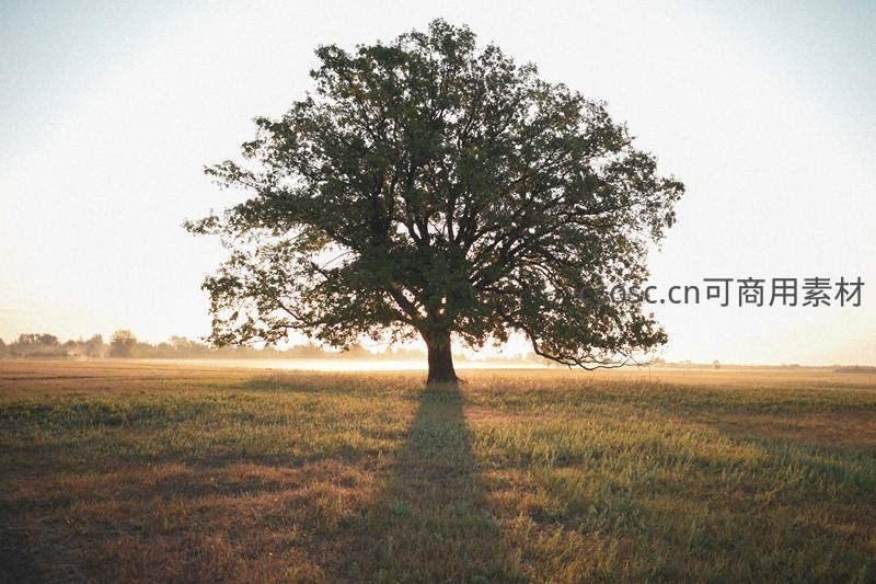 清晨薄雾笼罩的广阔原野上,一棵独立的大树沐浴在金色的朝阳中,长长的影子投射在草地上,画面温暖而宁静。