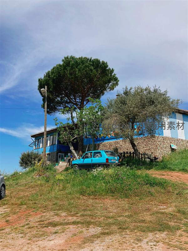 一座蓝白相间的乡村小屋掩映在绿树丛中,一辆复古小车停在门前,勾勒出一幅悠闲自在的田园生活画卷。