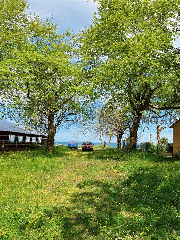 嫩绿的树叶与青翠的草地铺展眼前,一条小径穿过林间直通蔚蓝大海,充满生机与活力的春日气息扑面而来。