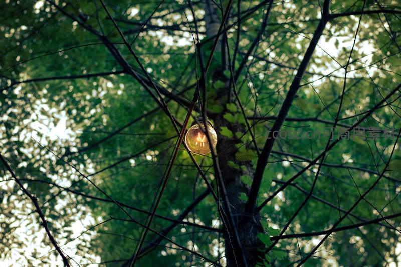 树影中的复古灯泡,自然与人造光的交融