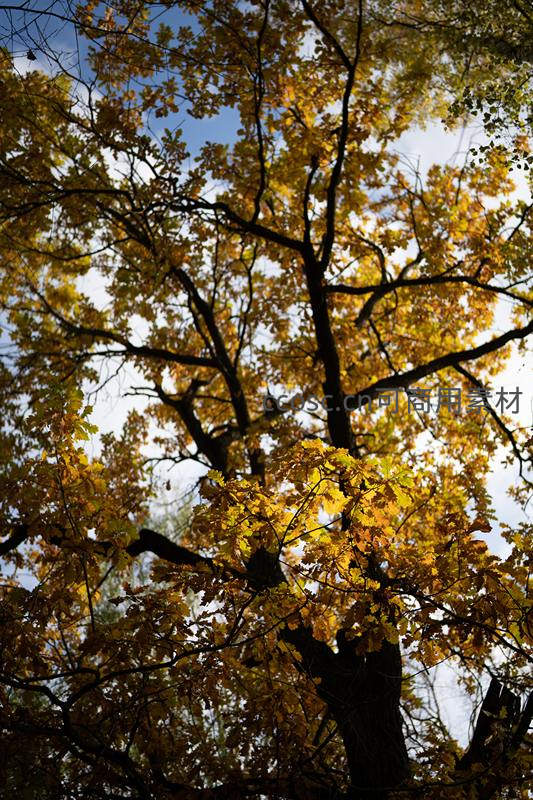 仰拍视角下,秋日的树冠被阳光染成一片金黄,叶片在蓝天映衬下透出温暖光芒,展现季节更替的细腻之美。