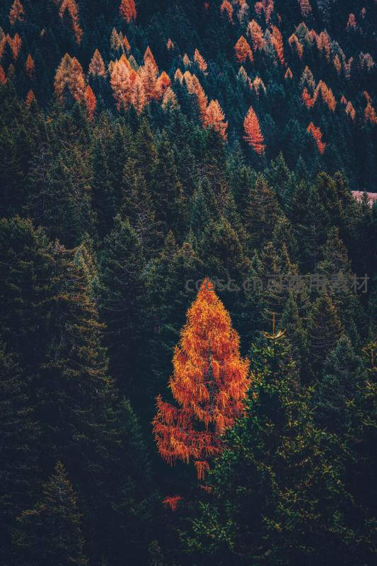 从高空俯瞰,一片深绿针叶林中,一棵通体金红的落叶松如同火焰般醒目,成为秋日山野中最耀眼的焦点。
