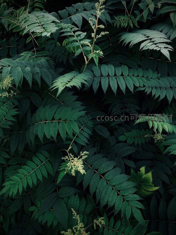 茂密的深绿色复叶层层交叠,在微光下展现出丰富的纹理与层次,几簇淡黄花序点缀其间,尽显自然生命力。