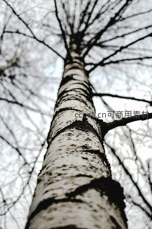 从低角度仰拍一棵高耸的白桦树,洁白斑驳的树皮与交错的枯枝伸向灰白天空,营造出肃穆而壮丽的视觉效果。