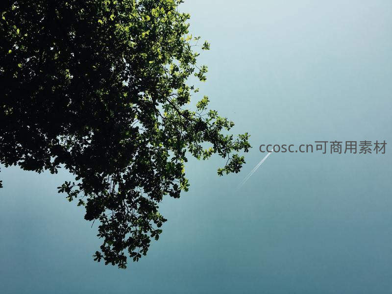 绿叶树冠与蓝天飞机尾迹的宁静画面