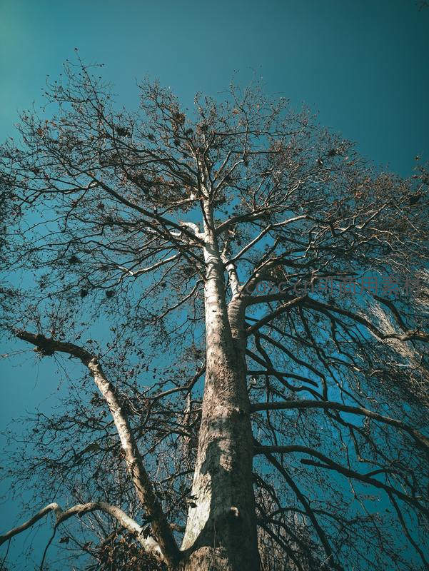 从低角度仰望一棵高大的落叶乔木,其粗壮的树干和繁复的枝桠伸向纯净的蓝色天空,展现出树木的雄伟姿态与自然的力量。