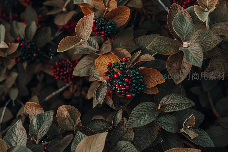 微距镜头下,红绿相间的浆果簇拥在深褐色的枯叶间,色彩对比强烈,展现出秋日自然凋零之美与生命的最后绚烂。