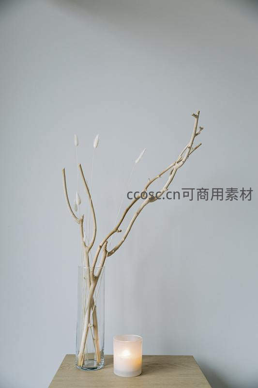 透明玻璃花瓶中插着几支天然干枝,旁置一盏暖光蜡烛,置于木质桌面上,构成一幅简约而温馨的居家装饰画面,充满生活气息。