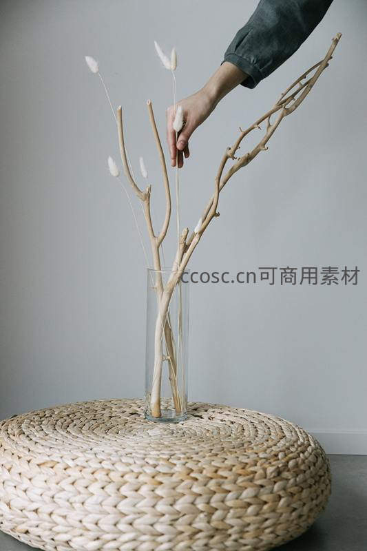 一只手轻轻触碰玻璃花瓶中插着的白色兔尾草干枝,下方是圆形编织坐垫,场景温馨宁静,展现了人与家居装饰的温柔互动。