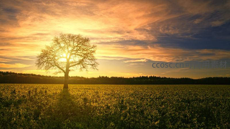 一棵光秃的树矗立在广袤的金色田野中央,夕阳从其枝干间穿透洒下光芒,天空云彩绚烂,整个画面洋溢着丰收季节的温暖与宁静。