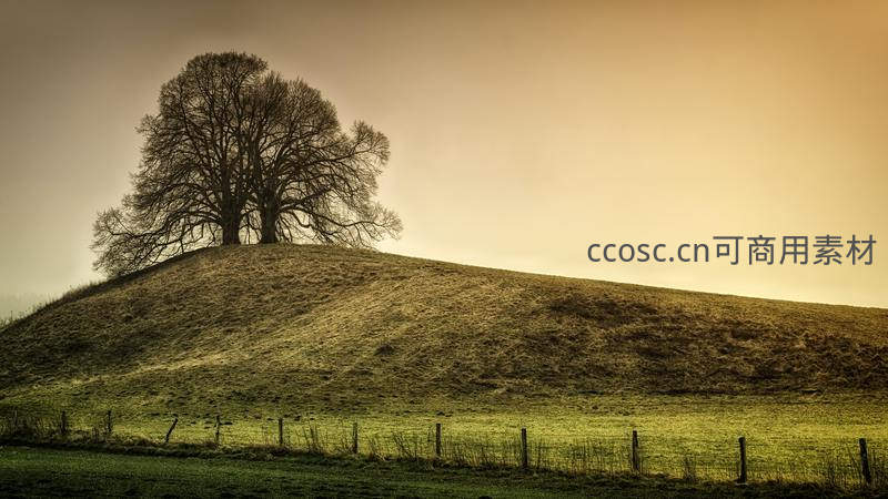 一棵枝干遒劲的枯树独自矗立在起伏的草坡上,柔和的暖光笼罩着整个画面,远处田野与围栏勾勒出宁静而略带苍凉的乡村景致。