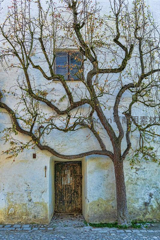 一株枝干扭曲的老树紧贴着斑驳的白色老墙生长,其枝条巧妙地框住了一扇陈旧木门,石板路铺展在前,散发着浓厚的历史与人文气息。