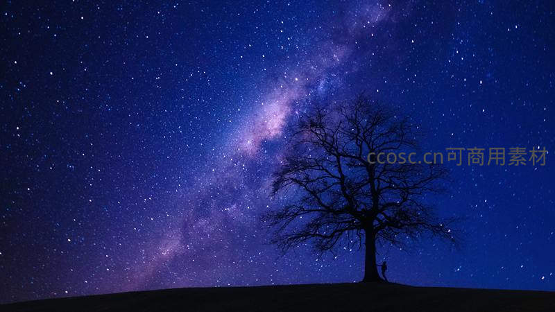 在深邃的夜空中,璀璨的银河横跨天际,一棵孤独的树静静伫立在山丘上,其剪影与星光交相辉映,营造出一种神秘而宁静的氛围。