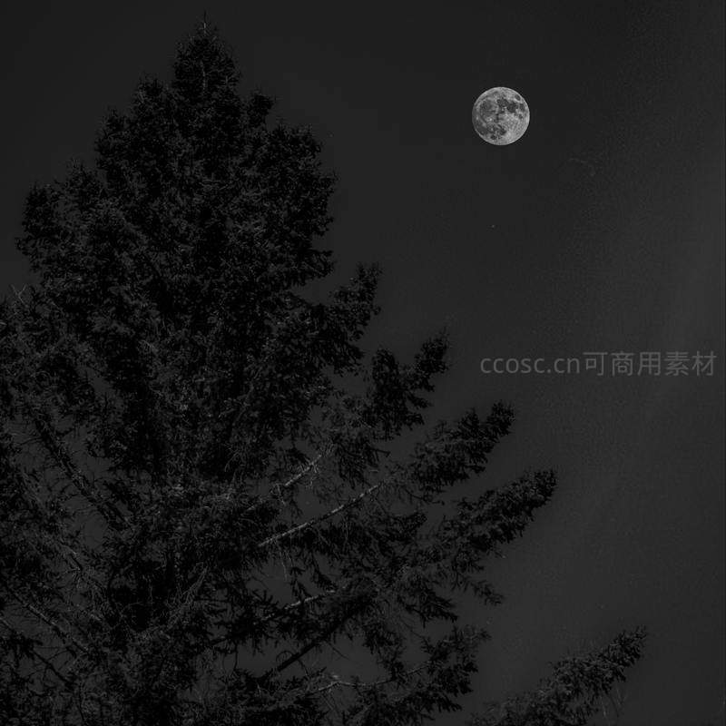 采用黑白摄影手法,一轮皎洁的满月高悬于夜空,前景中松树的轮廓在月光下化为深邃的剪影,画面简洁而富有诗意,传递出静谧与永恒之感。