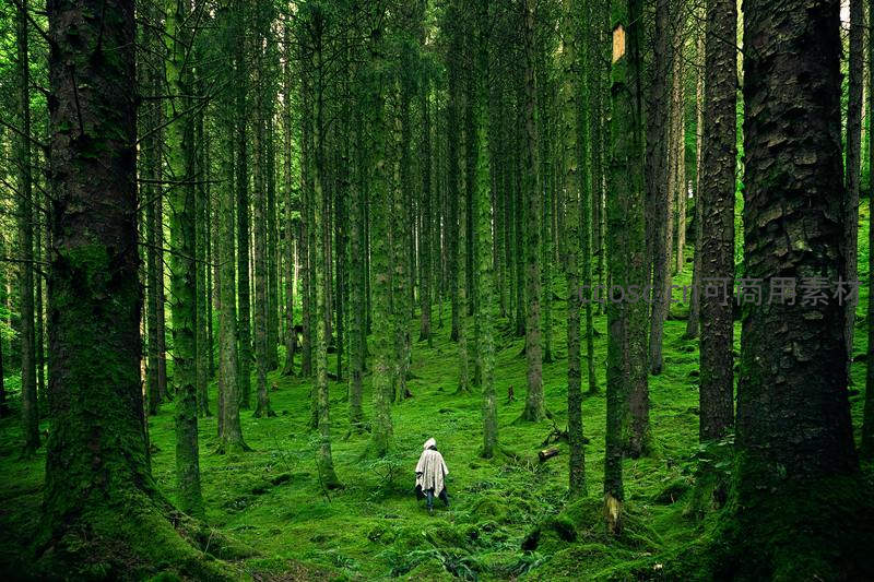 一位旅者背影穿行于苍翠挺拔的针叶林中,脚下是厚实柔软的苔藓地毯,四周寂静无人,只有自然之声,充满探险与冥想的意境。