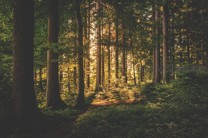 金色阳光穿过高耸林木洒向林间地面,光影交错,绿意盎然,展现原始森林深处的静谧与生命力。