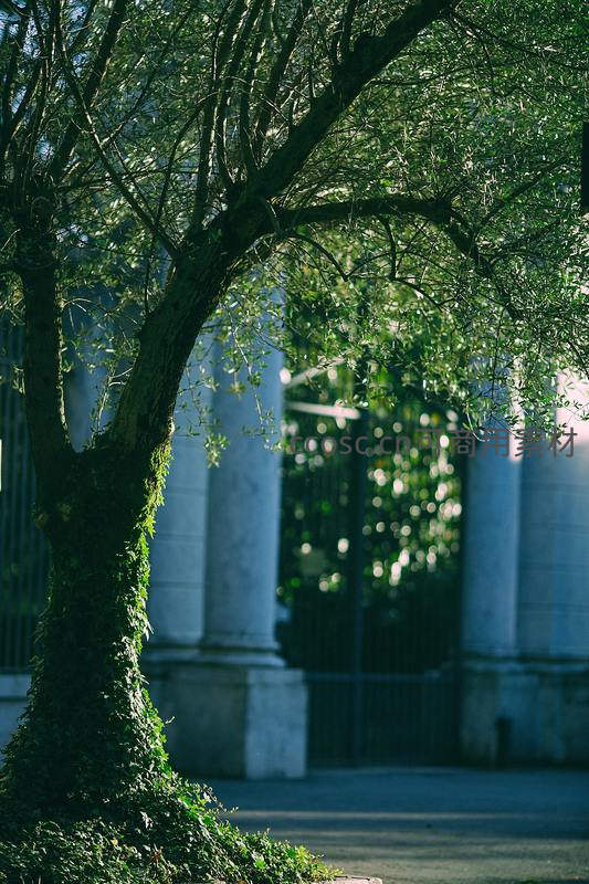 一棵老橄榄树被翠绿藤蔓温柔包裹,背景是模糊的石柱与铁门,营造出古典庭院中自然与人文交融的诗意氛围。