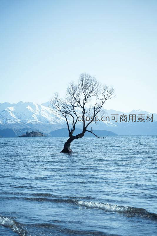 一棵孤独的枯树挺立于清澈湖水中,远处连绵的雪山在晴朗蓝天下清晰可见,构成一幅宁静、壮丽且极具视觉冲击力的自然风光画卷。