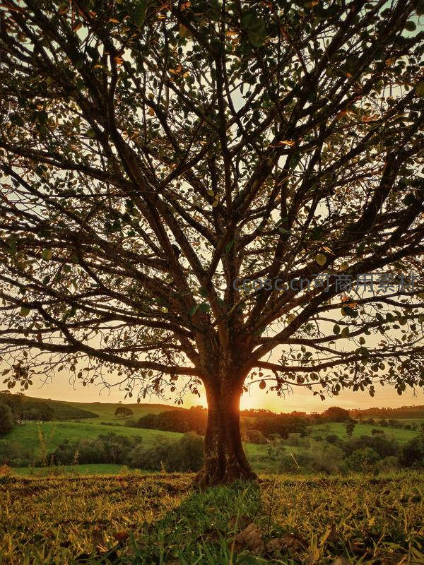 夕阳穿过古树,洒满金色田园