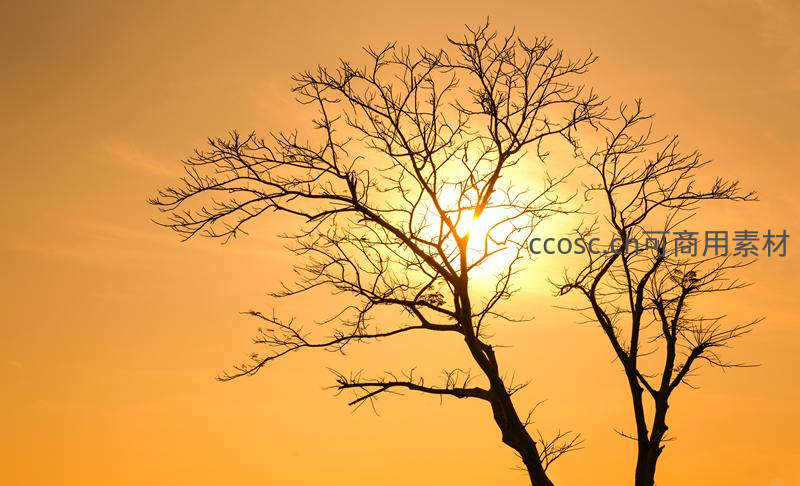 两棵光秃的树木在火红的夕阳下化为黑色剪影,其交错的枝干勾勒出优美的线条,与温暖的橙黄色天空形成强烈视觉冲击。