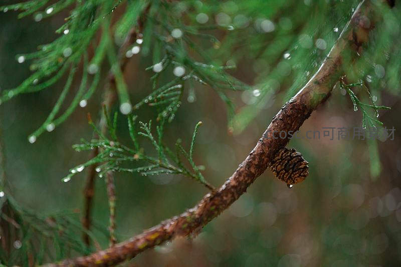 雨后松树枝叶上挂满晶莹水珠,一粒小巧松果静静依附在湿润的枝干上,背景虚化营造出宁静深邃的森林氛围。