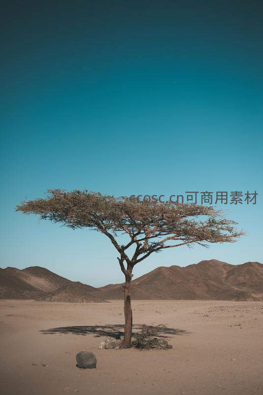 广袤无垠的沙漠中,一棵形态独特的孤树独立于沙丘之上,背后是连绵起伏的褐色山脉和纯净如洗的蔚蓝天空。