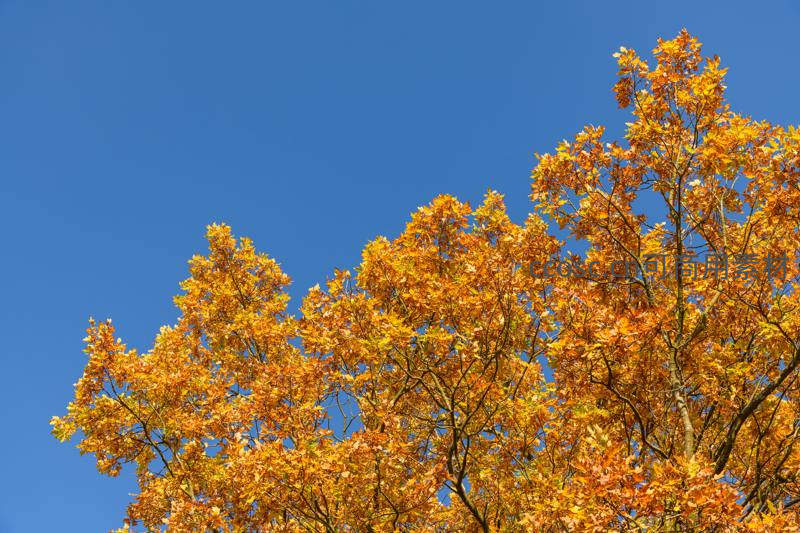 湛蓝无云的天空下,一树浓密的秋叶呈现出耀眼的金黄色泽,在阳光的照射下熠熠生辉,完美诠释了秋日丰收与绚烂的自然之美。