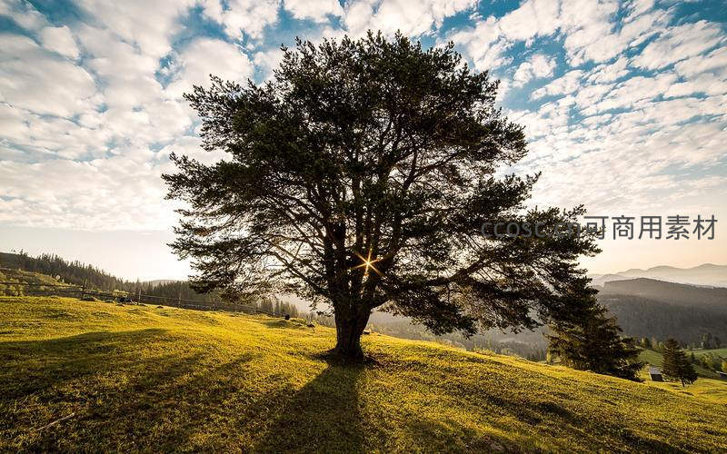 在金色晨光的映照下,一棵孤树伫立于起伏的绿色山丘之上,阳光穿透树叶形成星芒,远处层峦叠嶂,天空云卷云舒。