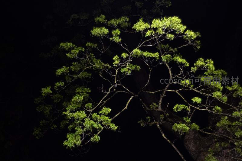 漆黑背景下,被照亮的树枝与嫩绿叶片形成强烈视觉对比,仿佛夜空中绽放的生命之花,散发出神秘而宁静的艺术气息。