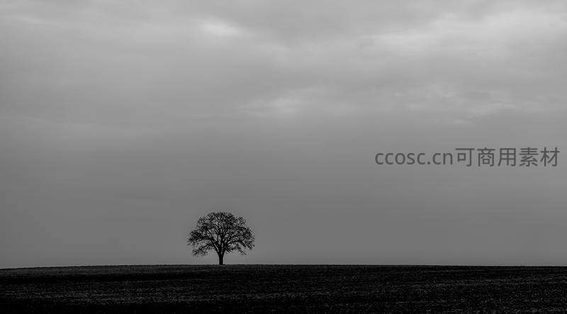 广袤田野中央一棵孤树在阴沉天空下形成鲜明剪影,黑白对比强化了画面的空旷感与哲学意味,传递宁静与思索。