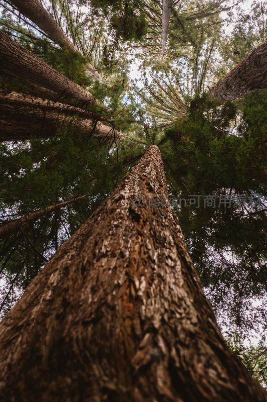 以低角度仰视拍摄,粗壮的树干直指苍穹,茂密的树冠遮天蔽日,阳光透过缝隙洒下,让人感受到森林的宏伟、古老与生命的蓬勃力量。