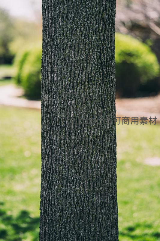 聚焦于树干表面,细腻的纹理和粗糙的质感被清晰捕捉,背景是模糊的绿色草地,突显了自然造物的精妙细节与朴实无华的美感。