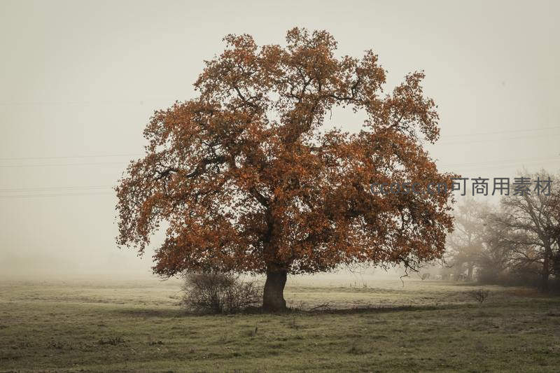 一棵枝繁叶茂的橡树在薄雾笼罩的清晨田野中独自伫立,叶片泛着温暖的橙黄色调,营造出静谧、诗意又略带忧郁的秋日氛围。