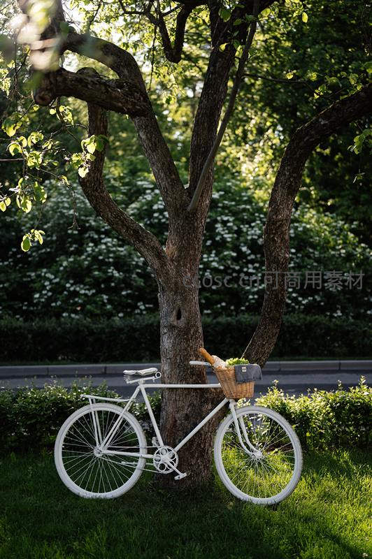 一辆洁白的复古自行车停靠在郁郁葱葱的大树旁,车篮里放着面包和鲜花,营造出悠闲惬意的午后时光氛围。