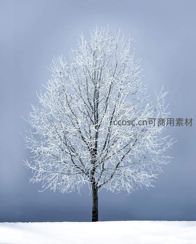 一棵被厚厚冰霜覆盖的树在雪地中傲然挺立,枝条晶莹剔透,宛如精雕细琢的艺术品,散发着清冷而纯净的美感。