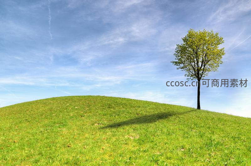春日阳光下,一座圆润的小山丘上挺立着一棵纤细的树,投下长长的影子,与蓝天白云共同构成诗意田园景致。