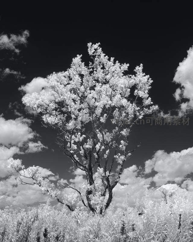 通过红外摄影技术,树木和植被呈现出梦幻般的白色,与深邃的黑色天空及蓬松白云形成强烈对比,营造超现实氛围。
