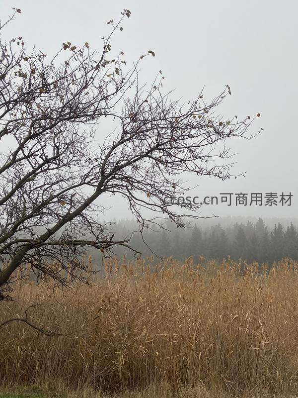 冬季的清晨,光秃的树枝在寒风中微微摇曳,背景是朦胧的雾气和金黄的芦苇丛,整个画面弥漫着清冷而宁静的萧瑟感。