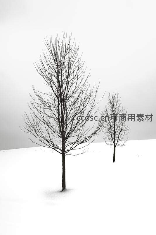 两棵形态各异的枯树在纯白的雪地上形成鲜明对比,灰白色的天空衬托出极简主义的视觉美感与宁静氛围。