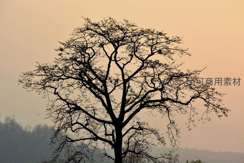 夕阳余晖下,树木轮廓清晰如墨,枝条交错形成复杂图案,背景是柔和的橙色天空,传递出宁静与时间流逝的美感。