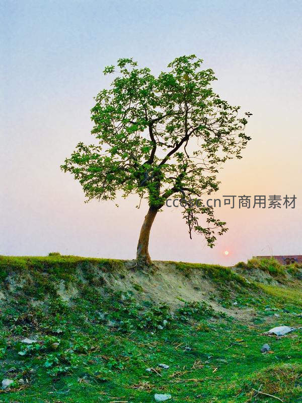 一棵孤树静立在起伏的土坡之上,夕阳西下,天空被染成柔和的粉橙色,树影与草地构成一幅宁静而诗意的田园画卷。