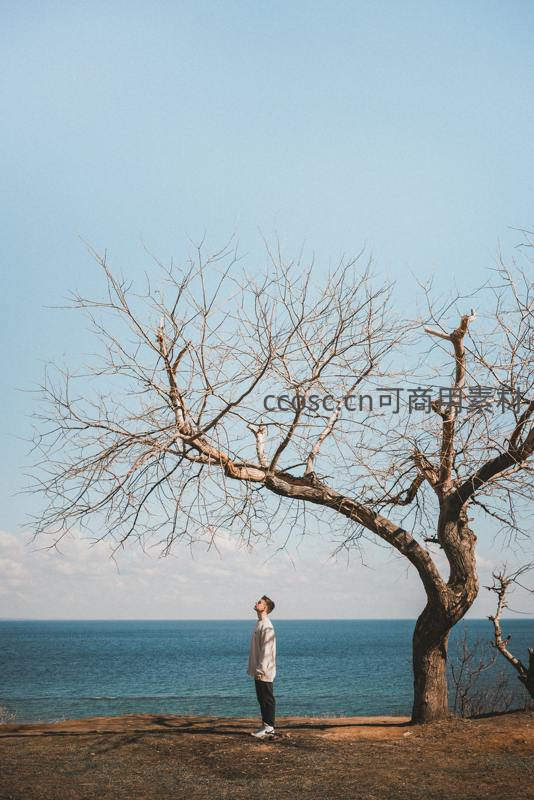 一位男子伫立于光秃的枯树旁,面朝浩瀚大海,抬头凝视湛蓝天空,画面充满哲思与孤独感,传递人与自然的静谧对话。