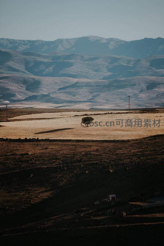 广袤的黄褐色原野延伸至连绵起伏的远山脚下,一棵孤树静静伫立,投下长长的影子,勾勒出大地的苍茫与生命的坚韧。