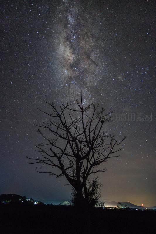 璀璨银河横贯深邃夜空,一棵枯树以黑色剪影姿态矗立其中,远方地平线微光闪烁,营造出宇宙浩瀚与生命寂寥的震撼对比。