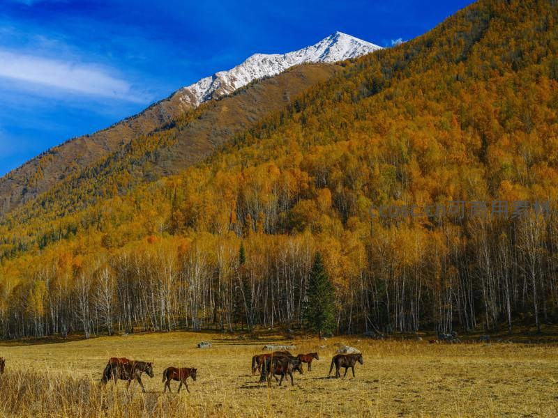 在白雪皑皑的山峰和绚烂秋林的环抱下,一群骏马在广阔的草地上悠闲踱步,构成一幅充满生机与野性的高原牧歌图景。