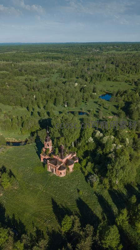 从高空俯瞰,一座红砖古教堂静卧于无垠的绿色原野之中,四周环绕着茂密森林与清澈湖泊,宛如遗世独立的宁静圣地。