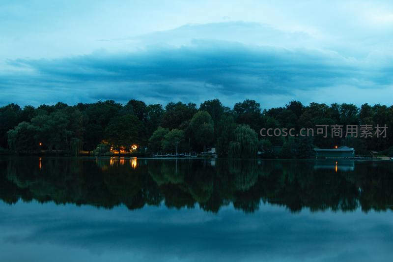 黄昏时分,平静的湖面如镜,清晰倒映着岸边的树木与温暖灯光,天空云层低垂,整个画面弥漫着静谧安详的夜晚气息。