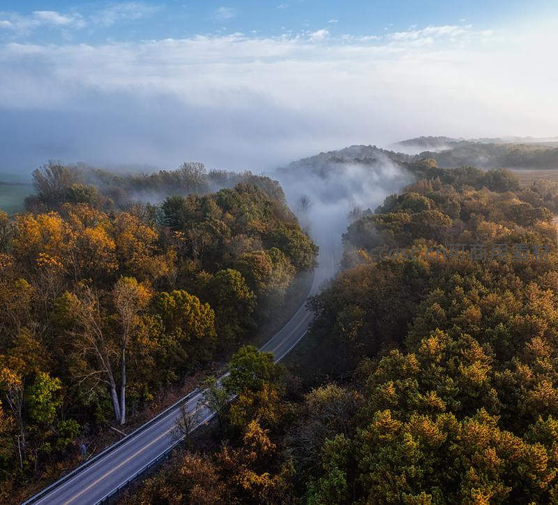 清晨薄雾轻抚着层林尽染的山野,一条蜿蜒公路如玉带般穿行其间,金色阳光穿透云雾,为这幅秋日画卷增添了温暖与诗意。
